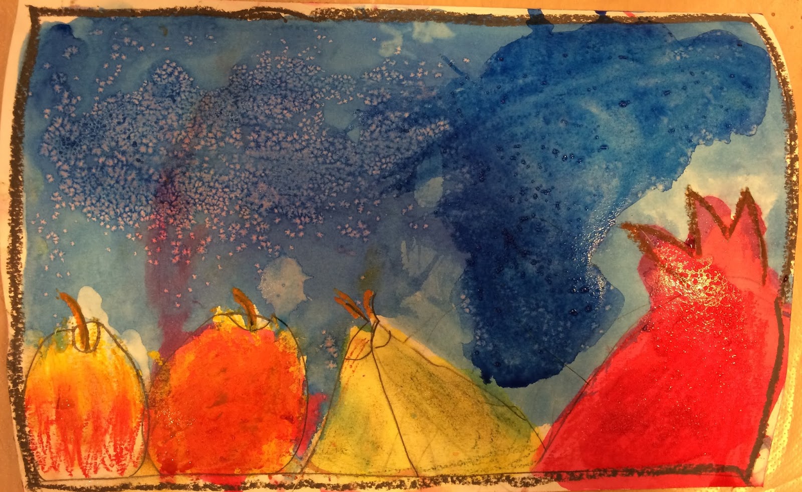 We used oil pastels just to color some of the lines and the texture on the fruits. For example, we added some red and green lines on the apples and red and brown lines on the pomegranates. I also demonstrated how to add a few spots with the white pastel wherever I saw the shine on the fruits. I reminded them how water and oil don’t like each other and that we will use this fact to our benefit.